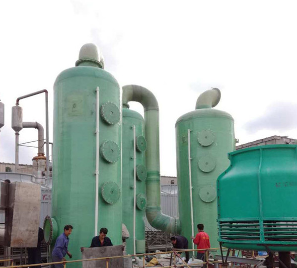 玻璃钢材质塔体就有耐酸碱抗腐蚀等特性,正常使用寿命三十年以上,玻璃钢吸收塔主塔内部结构紧凑多样;目前市场上比较普遍的主要是填料塔和喷雾式气体塔为主。目前,我公司新研制的一种耐酸碱、耐腐蚀的新型节能型吸收塔,不仅具有操作管理简单,占地面积小,净化效率高,而且使用寿命长等特点,被广泛应用于硝酸、硫酸等有害雾气等工艺设备的处理。我厂生产的玻璃钢吸收塔具有能耗低、结构简单、占地面积小,适用范围广,工艺简单,,净化吸收效率高特点,能有效去除氟化氢气体(HF)、氰氢酸气体(HCN)、氨气(NH3)、硫酸雾(H2SO4)、碱蒸气(NaOH)、铬酸雾(CrO3)、福尔马林(HCHO)氯化氢气体(HCl)、硫化氢气体(H2S)等水溶性气体。酸雾废气由引风机风管引进净化塔主塔体内部,经过主塔内的填料层,使废气与氢氧化钠吸收液进行气液两相充分接触吸收中和反应,酸雾废气经过净化后,再经除雾板脱水除雾后由风机排入大气。吸收液在塔底经水泵增压后在塔顶喷淋而下,回流至塔底循环使用。净化后的酸雾废气达到山东省地方排放标准的排放要求,低于国家排放标准。